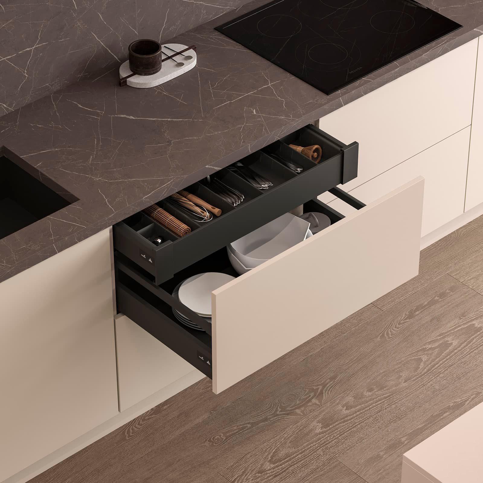 Модель «Антико», выполненная в современном стиле, органично вписывается в кухонное пространство. Светлые фасады создают ощущение чистоты, свежести и простора. В гармоничный контраст с ними вступает столешница, стеновая панель в цвете коричневого керамогранита и черная встраиваемая техника. Оригинально выглядит остров, объединяющий систему хранения, рабочую поверхность и обеденный стол. Пластиковые покрытия обеспечивают прочность и долгий срок эксплуатации гарнитура. Материал водонепроницаемый, не боится механических и химических воздействий, неприхотлив в уходе.
